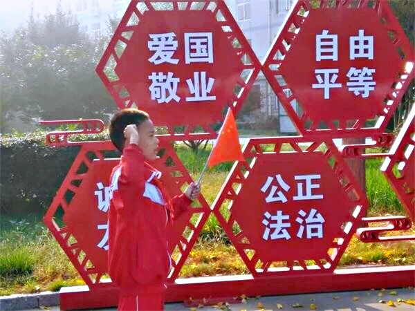 国旗班护卫着国旗送上升旗礼台,在国歌响起的那一刻,全场肃立,师生们高昂的国歌声,伴随着五星红旗冉冉升起,随风飘扬。面对着鲜艳的五星红旗,我们心潮起伏,热血沸腾。曾记得,百年多来,中华民族受侵略遭凌辱的历史;曾记得,中华儿女前仆后继,英勇斗争的峥嵘岁月;曾记得,五星红旗在天安门广场升起的那一刻……我们深深懂得,今天的幸福生活来之不易;我们深深懂得,没有共产党就没有新中国!看今朝:蛟龙入海、神五飞天、“嫦娥”登月、“悟空”遨游太空、港珠澳大桥、“中国天眼”射电望远镜……每一项都让我们深感自豪,深感祖国的日益强大。