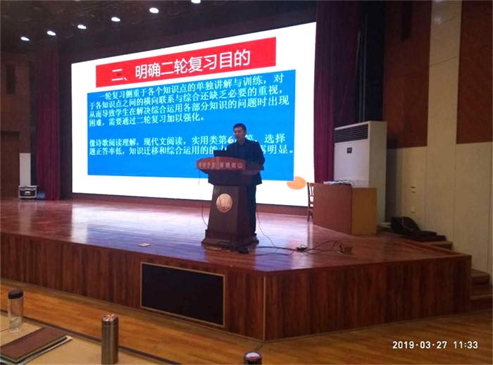 26日下午,首先由潍坊市语文教研员杜殿收老师对潍坊市一模考试进行分析,重点对一模试题命题思路和学生答卷出现的问题进行详细说明,并对高三二轮复习提出指导意见。