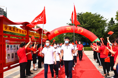 接下来,伴随着激昂雄壮的乐曲,各班班主任带领学生,高举班旗、励志旗,依次踏上红毯,迈进“助力门”,走过“成功门”,通向成功路。全体任课老师分列红毯两旁,为同学们加油祝福。